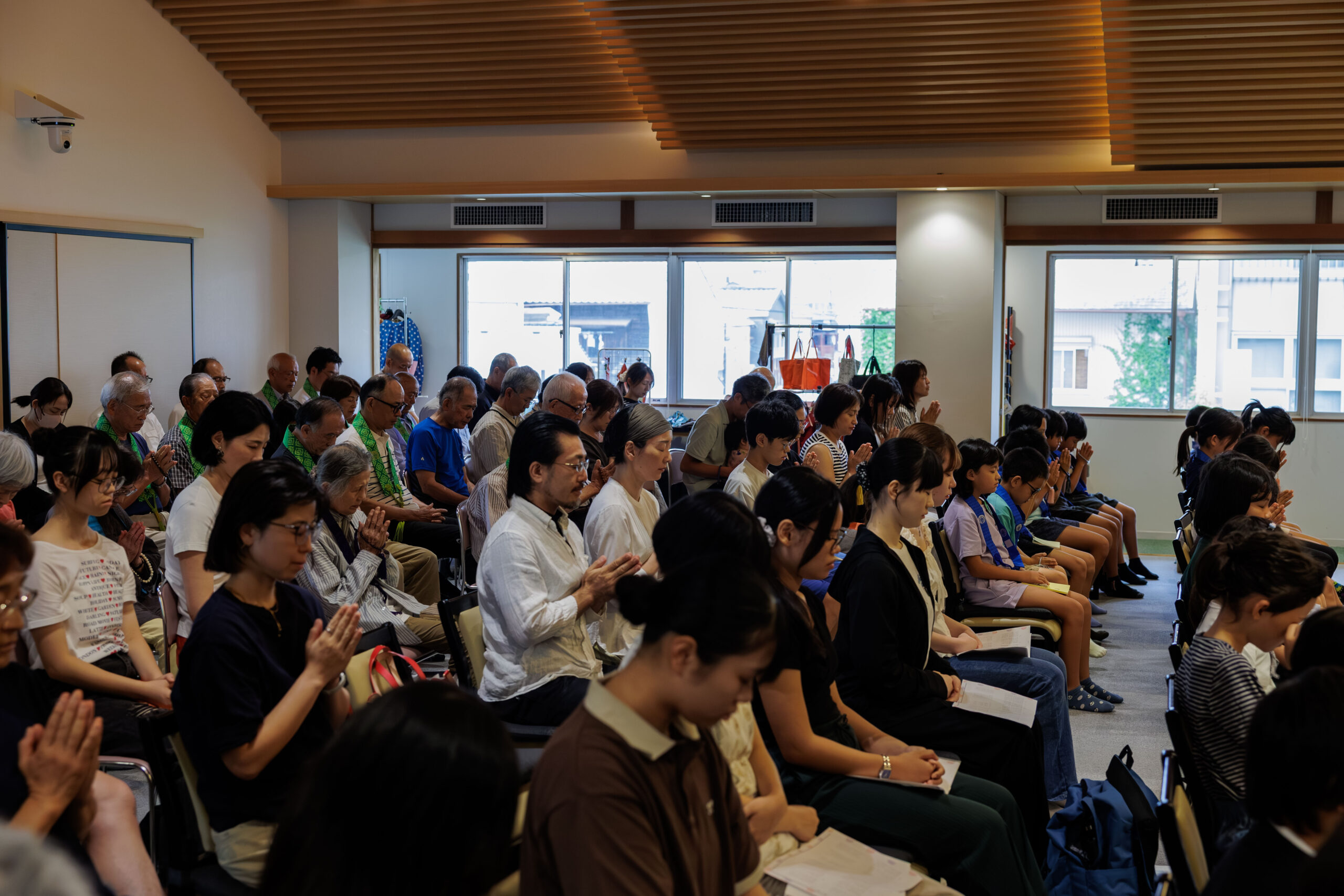 8月9日、長崎原爆の日にあわせて行われた平和の鐘、今年は戦後80年という節目の年でもあります。前々からお知らせしていたように、今回は、門信徒の皆様や少年会の子ども達に加えて、静岡市国際交流協会主催の「夏休みこどもシアター」の参加者やその関係者もご参加くださいました。総勢100名程だったでしょうか、大勢の皆さまと平和への想いを共にいたしました。まずは「らいはいのうた」をおつとめして、その後広島の平和記念式典で朗読された「平和への誓い」と、沖縄全戦没者追悼式で朗読された「平和の詩」、いずれも小学6年生によるものでしたが、それを聞いていただきました。被爆者や戦争体験者がどんどん少なくなっていく中で、とにかくそのことを聞いていくこと、そしてそのことを伝えていくこと、その大切さをあらためて感じたスピーチでした。