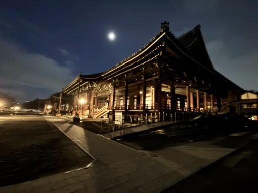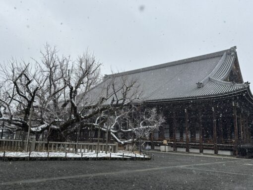 それにしても京都は寒かったです。特にお朝事は、朝6時のまだ真っ暗な中始まりますが、空調のない本堂ですので、着込めるだけ着込んでいきました。お勤め中はそこまで感じなかったのですが、お勤めが終わってご法話の時間や御文章拝読の時間は、着込んでいても震え上がりました。声を出していると暖かくなるんだなぁと実感しました。お朝事が終わってから、段々と雪が激しくなって来て、全国各地からの参加でしたので、交通事情もあり、少し早めに終了、スタッフも早めに解散となりました。新幹線は通常運転でしたので、予定より早く帰れたのですが、2日間の研修会はかなり疲れました。