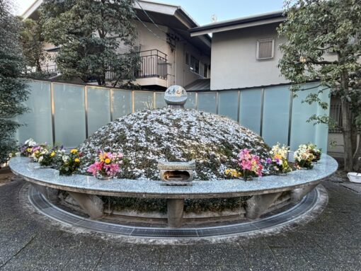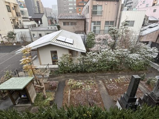 すると、なんと静岡でも雪が降りましたね。夕方には境内の植物にうっすらと白く雪が積もりました。本当に久しぶりだと思います。今朝まで法縁廟には雪が残っていました。