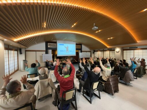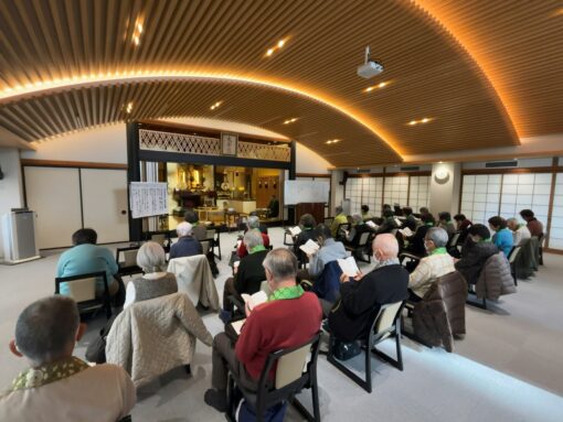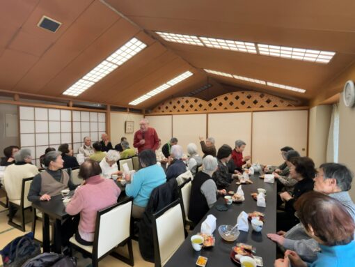 21日は覚寿の会の新年会があり、30名弱の皆さまが集まりました。お勤めと前住職の法話を聞いた後は、お楽しみの会。唱歌を何曲か歌ったり、椅子に座りながら体操をしたり(特に肩甲骨がほぐれます!)、皆さまで談笑しながら会は進んでいきます。