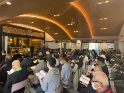 門信徒会初例会は、お昼の座に90名、夜の座に27名、合計117名の皆さまにご参拝いただきました。初例会ということで真宗宗歌を一緒に歌いました。そして今月は法語カレンダーの表紙の言葉「これからがこれまでを決める」と、一月の言葉「み教えによって自分のありのままの相が知らされるのです」を、両方味わわせていただきました。本当に偶然ですが、どちらの言葉も私が刑務所でお話しさせていただいている内容でした。ただ、刑務所で私が担当している時間は宗教の時間ではなく、刑執行開始時指導という時間なので、宗教の話はできず、どちらかというと道徳的な話になってしまいます。ですので、同じ言葉でも(特に前者)伝える内容は若干違います。この度は浄土真宗的な味わいをお話しさせていただきました。この私にこれから間違いなく起こること、それは死です。逃れることはできません。その死というものをどのように受けてとめていくのか、死んで終わりの人生なのか、そうでないのか。そのことが私の人生そのものの意味を決めるのだと思います。「後生の一大事」と蓮如上人がお示しくださった私たちの「これから」を、共に聞き続けていく一年になればと思います。皆さま、ようこそお参りくださいました。