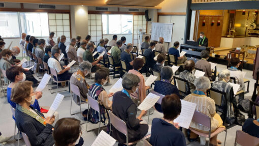 さて、門信徒会例会はお昼の座は70名、夜の座は23名がお参りくださいました。今月は伊東慧明師の「悲しみあるがゆえによろこびあり 煩悩あるがゆえに菩提あり」というお言葉を味わわせていただきました。最後に、住職継職記念歌の「ゆずりは」をみんなで歌いました。この歌は総代の松井誠司さんが詞を作ってくださり、その詞に前住職が曲をつけたものです。法要当日にはゲストの二階堂和美さんが歌ってくださる予定です。楽しみですね。