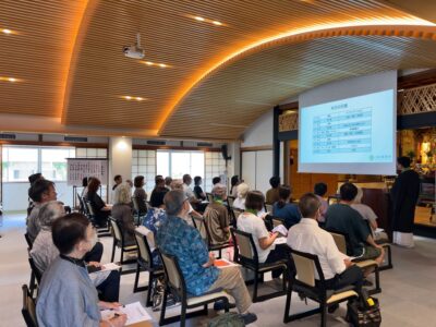 そして昨日の日曜日は、門信徒初級講座が開かれました。午前10時から午後3時までの長丁場ですが、24名の参加者が最後まで熱心に受講してくださいました。第1講は「仏事・作法・お仏壇」がテーマで、基本的な作法からご法事やお仏壇のことなど、一番身近なところから学びます。そして第2講は「仏教とは?浄土真宗とは?」と題し、仏教、そして浄土真宗の基本的な教えの部分を学びます。お昼ご飯をはさんで、第3講は「勤行・仏教讃歌」で、昼食後の眠気を覚ますべく、実際におつとめや歌の練習をします。そして第4講は「教覚寺のいろは」として、教覚寺の歴史や活動グループなどについてご紹介させていただきました(トップ写真)。最後にみんなでお菓子をいただきながら質問や雑談などして終了です。今年も暑い中、大勢ご参加くださり、本当に有り難いことでした。ご参加くださった皆さま、お疲れさまでした。