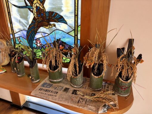 消臭効果もあり、調湿効果がある(湿度が高い時には湿気を吸収し、乾燥時には吸い取った湿気を吐き出す)竹炭。このように飾れば華やかさもあり、一石二鳥ですね!集まって頂いた皆さま、ありがといございました!
