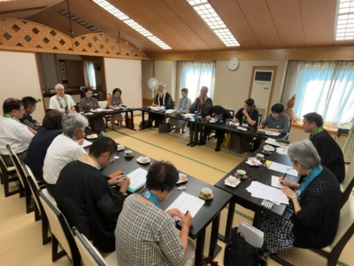 常願寺さま、長榮寺さま、潮見寺さま、満福寺さま、妙生寺さま、蓮舟寺さま、教覚寺。それぞれの寺族、仏教壮年会、仏教婦人会の役員の皆さまが集まり、お勤めをしてから、10月に行われる合同研修会の内容の詳細を詰めていきました。