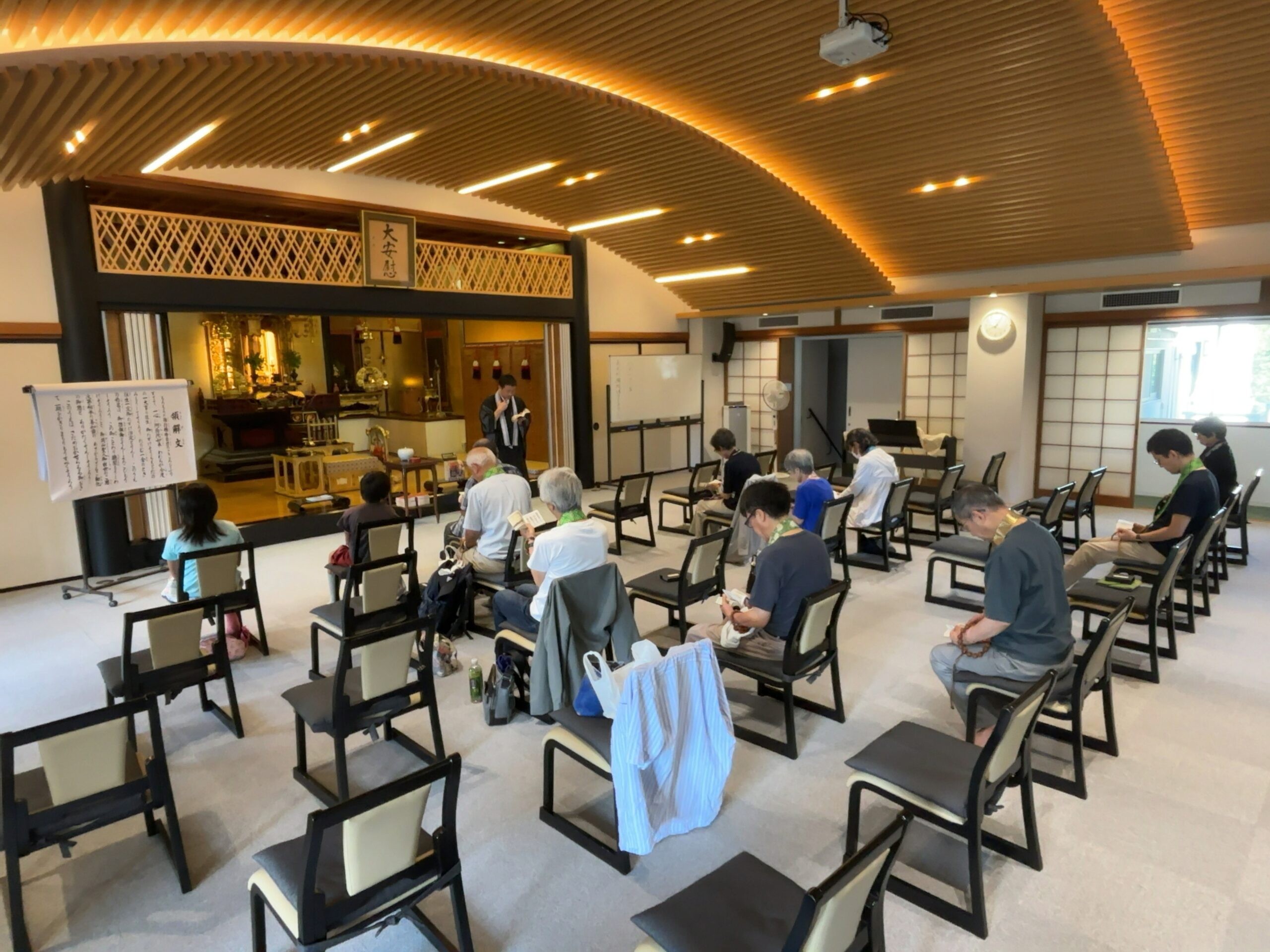 30分のお掃除時間の後は、本堂で正信偈和讃をお勤めします。住職の和讃の解説の後は、広間で皆さまで朝食を頂きます。