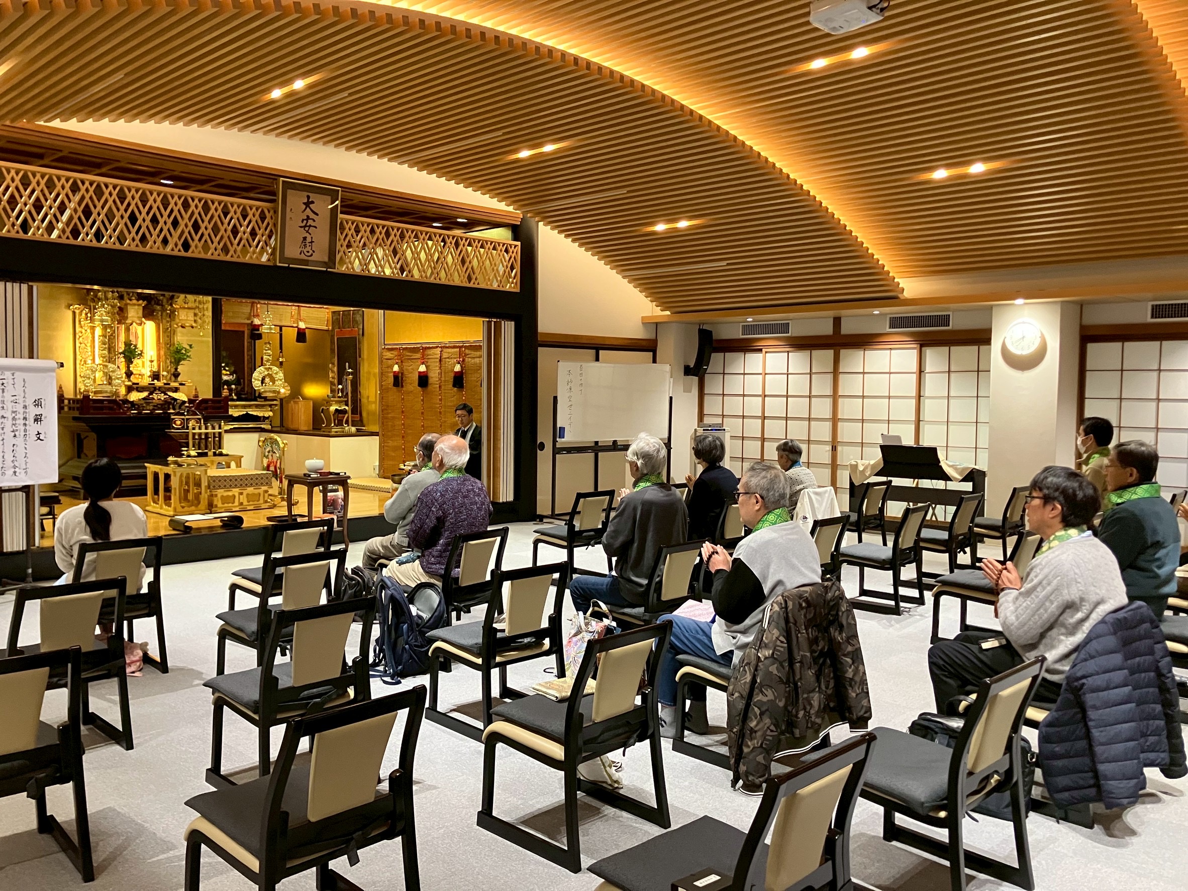 本日はお朝事会、13名の皆さまが来てくださいました。丁寧に境内のお掃除をして頂いたあとは、本堂でお朝事、正信偈と繰り読み和讃をお勤めし、和讃について住職より少し法話させて頂きました。
