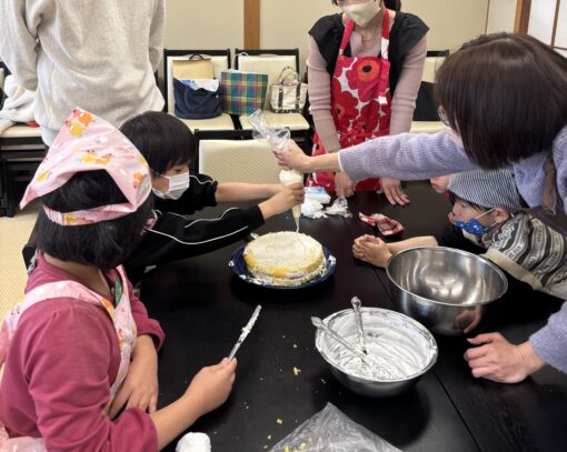 「自分たちが作ったのだから、大人にはあげたくない、全部自分たちだけで食べたい!」「いやいや、保護者の方が準備してくれたのよ、皆で分け合って一個ずつ一緒に美味しく食べよう!」と容赦なくケーキを大人へ配るため持ち去る私、という恒例のやりとりをして、皆で美味しく頂きました!大人も子どもも感動して食べていました(^^)