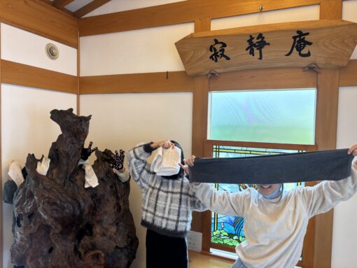 古木の後ろにも2人隠れております笑。ちょっと少なくて5人でしたが、おしゃべりしながら頑張ってくれました。雨が上がると、葉っぱ掃除もしてくれていました。壮年会は普段手が行き届かない場所や法縁廟の側溝、障子の補修など、女性の会は広間の掃除や本堂の窓拭きなど、皆さまに力を入れてお掃除して頂き、おかげさまで綺麗になりました。有難うございました<(_ _*)>!